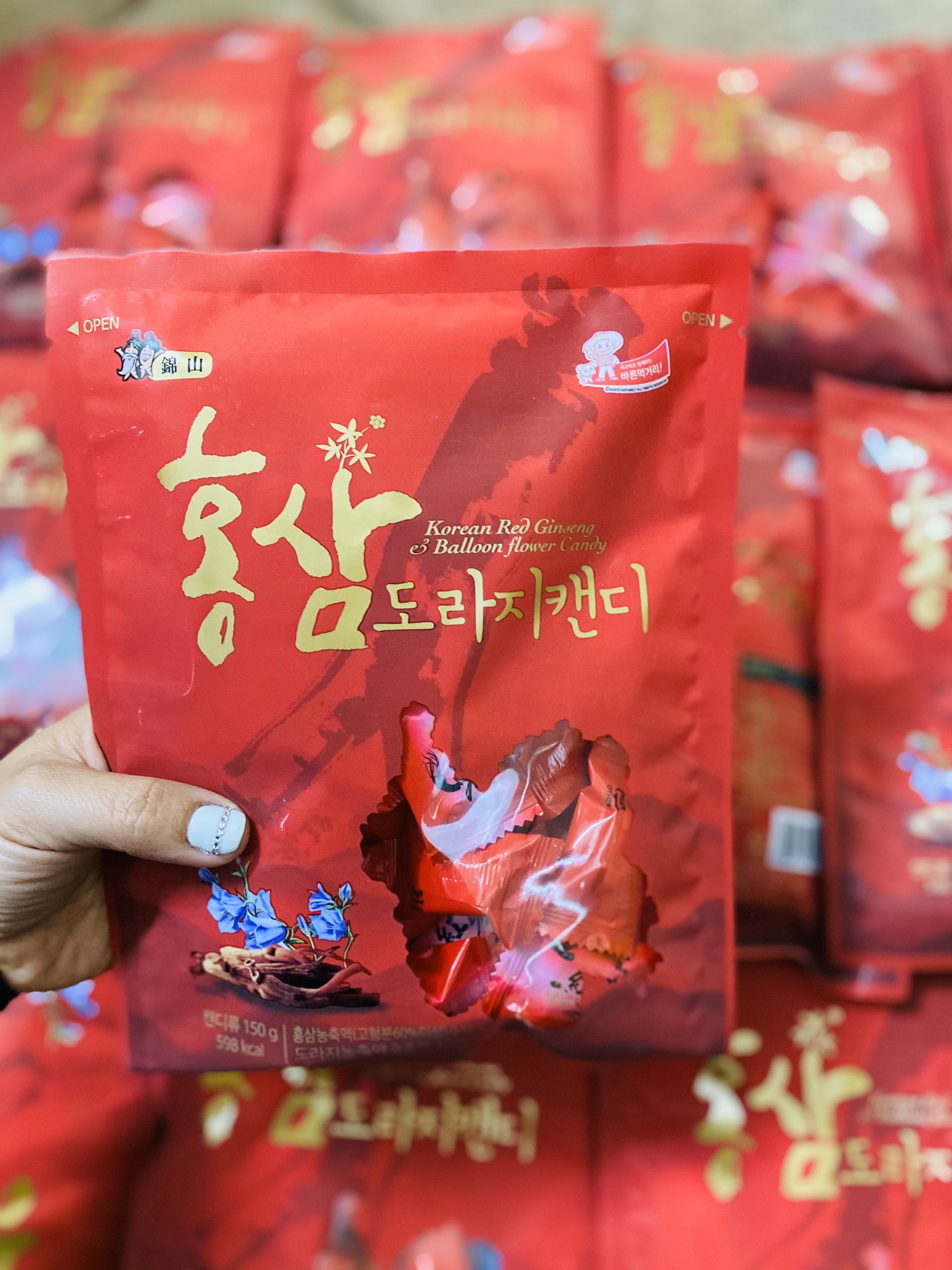Thành phần: Đường trắng, mạch nha, đường đen, chiết xuất hoa chuông (tinh chất cô đặc trên 60%) 0.2%, chiết xuất hồng sâm (tinh chất cô đặc trên 60%, tinh chất hồng sâm 70mg/g) 0.12%, hương hồng sâm.