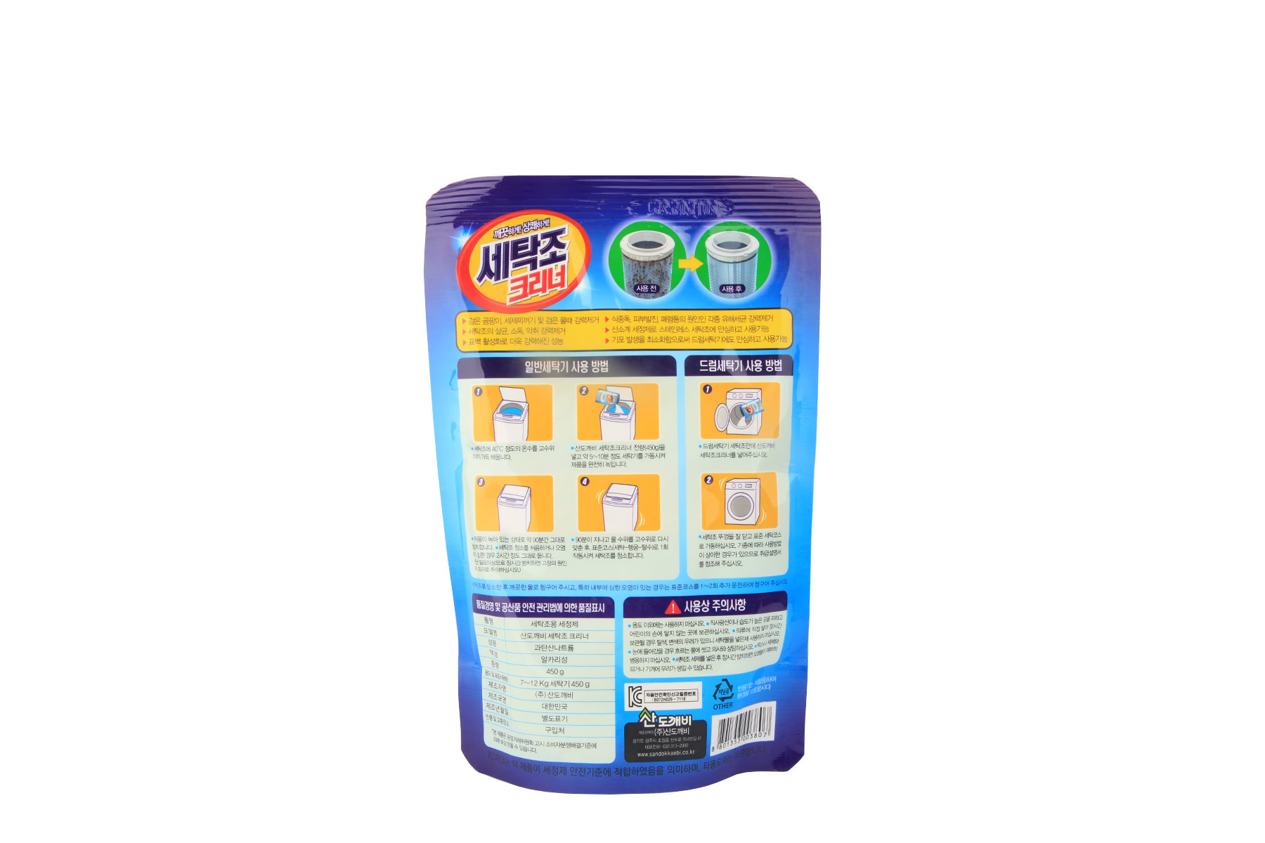 Bột tẩy vệ sinh lồng máy giặt Sandokkaebi dùng được cả cho cửa đứng và cửa ngang. Bột tẩy lồng máy giặt Sandokkaebi được sản xuất, đóng gói trên dây truyền hiện đại với trọng lượng 450g, vừa đủ để cho 1 lần tẩy rửa sạch.